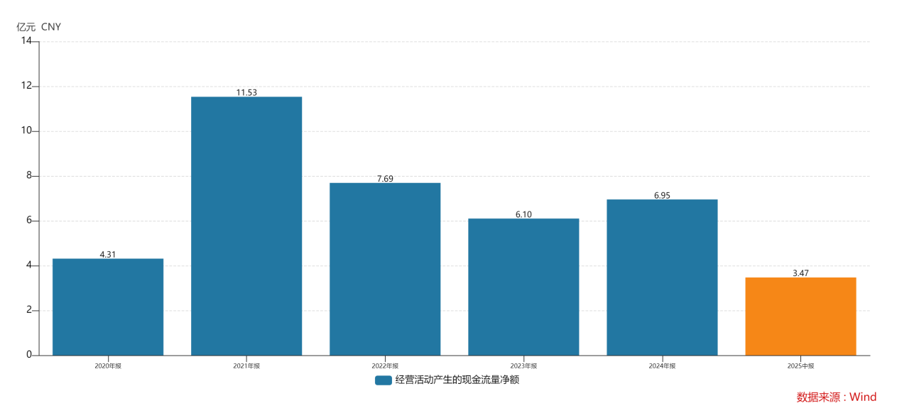 2025年上半年经营活动现金流净额为3.47亿元,同比增长145.70%,同时也远超净利润2.48亿,显示公司经营回款能力增强,在进行业务调整的同时,也控制住了经营风险。